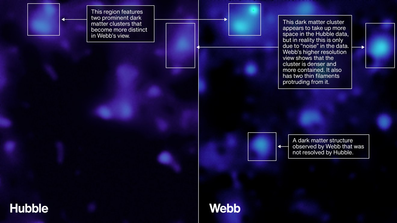 El mapa del Webb contiene aproximadamente 10 veces más galaxias que los mapas de la zona realizados por observatorios terrestres y el doble que el del Hubble. Revela nuevos cúmulos de materia oscura y captura una vista de mayor resolución de las áreas previamente observadas por el Hubble.