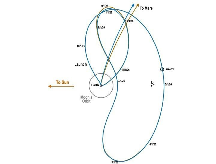 En lugar de dirigirse directamente a Marte, las naves espaciales de ESCAPADE primero girarán alrededor de un lugar en el espacio a un millón de millas de la Tierra llamado punto Lagrange 2. En noviembre de 2026, cuando la Tierra y Marte estén alineados, la nave espacial ESCAPADE regresará a la Tierra y usará la gravedad de nuestro planeta para impulsarse hacia Marte para su llegada en septiembre de 2027.