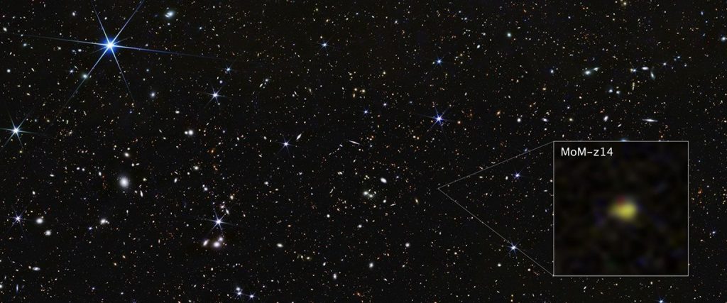 MoM-z14 forma parte de un grupo creciente de galaxias sorprendentemente brillantes en el universo primitivo: 100 veces más de lo que los estudios teóricos predijeron antes del lanzamiento del telescopio Webb, según el equipo de investigación.